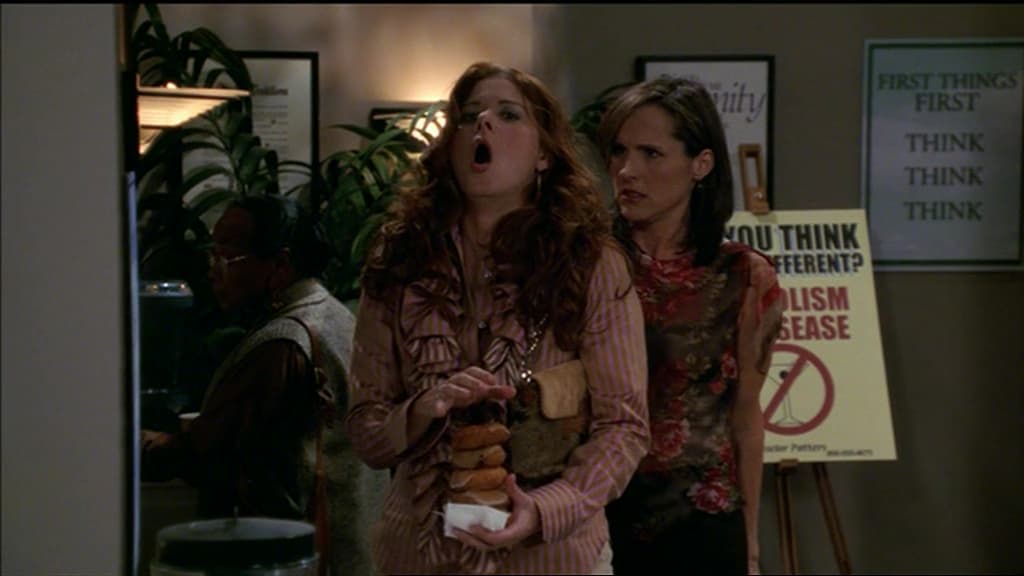 Grace has a surprise reunion with Val as she attempts to steal doughnuts at an AA meeting. She gets hooked on AA meetings for free therapy and food and Val and Karen have a confrontation which leads to Grace's exposure as a fraud. Meanwhile, Will and Jack attend a gay television focus group, only to have Will kicked out and Jack hired as Junior VP of New Programming.